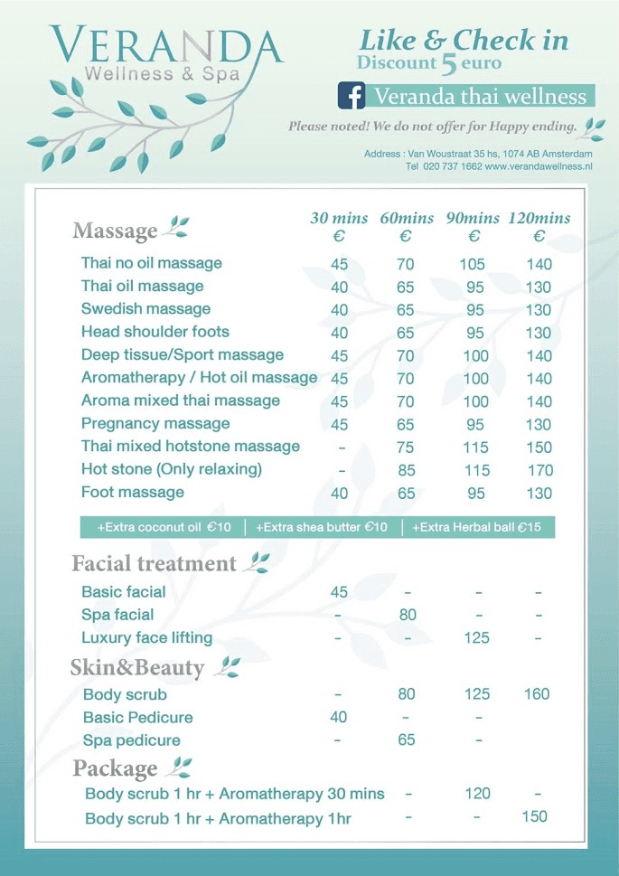Bij ons kunt u terecht voor de beste massage van Amsterdam uitgevoerd door de beste Thaise masseuses. In onze wellness bieden wij u verschillende massages aan. Dit kan een traditioneel Thaise massage zijn, maar wij voeren bijvoorbeeld ook sportmassages en Zweedse massages uit. Onderstaand vind u ons aanbod en een kleine uitleg per behandeling.